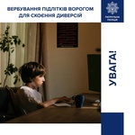 Останнім часом однією з найсерйозніших онлайн-небезпек є контент, що підбурює до диверсій та інших правопорушень. Найбільш вразливими категоріями, що легко піддаються впливу, стають діти та підлітки. Це спричинене особливостями їхнього психологічного розвитку, який перебуває на етапі формування. Злочинці активно використовують цифрові платформи, зокрема месенджер Telegram, для вербування українських підлітків. Вони створюють мережі ботів і каналів, де, під виглядом швидкого заробітку, пропонують неповнолітнім виконати небезпечні завдання.